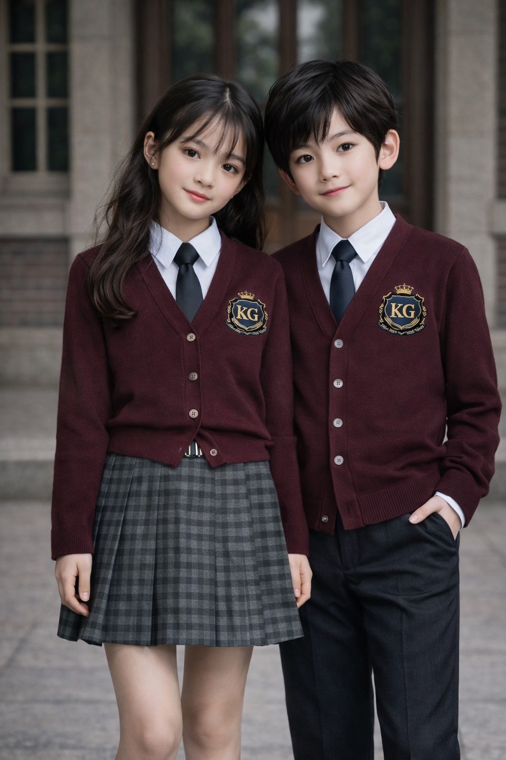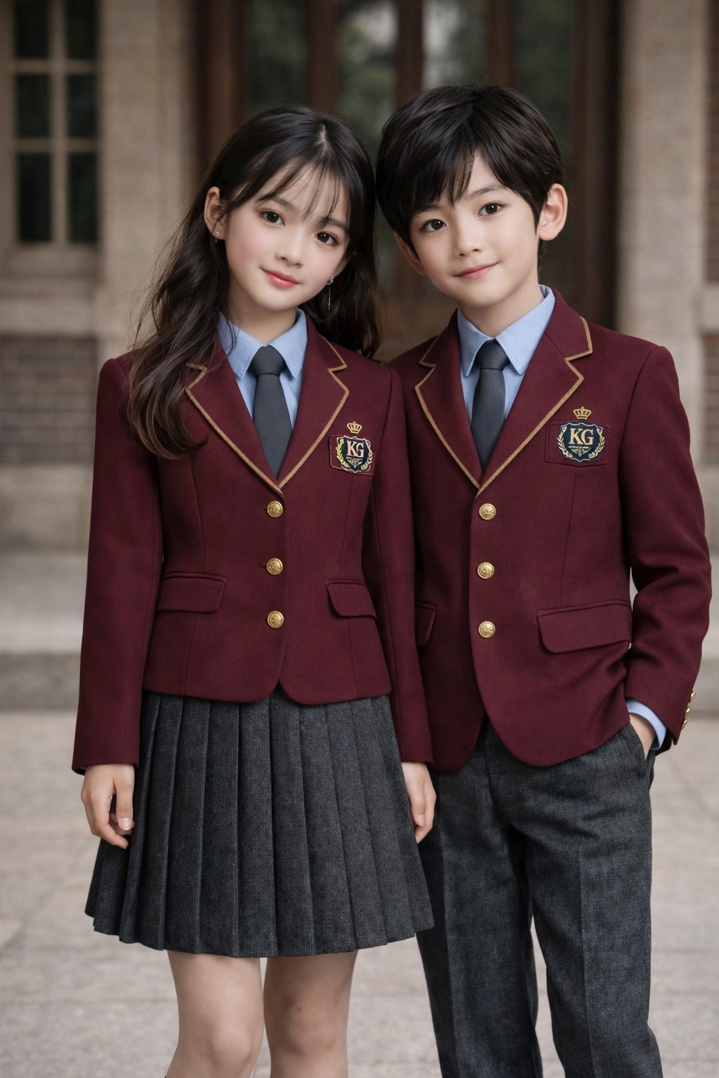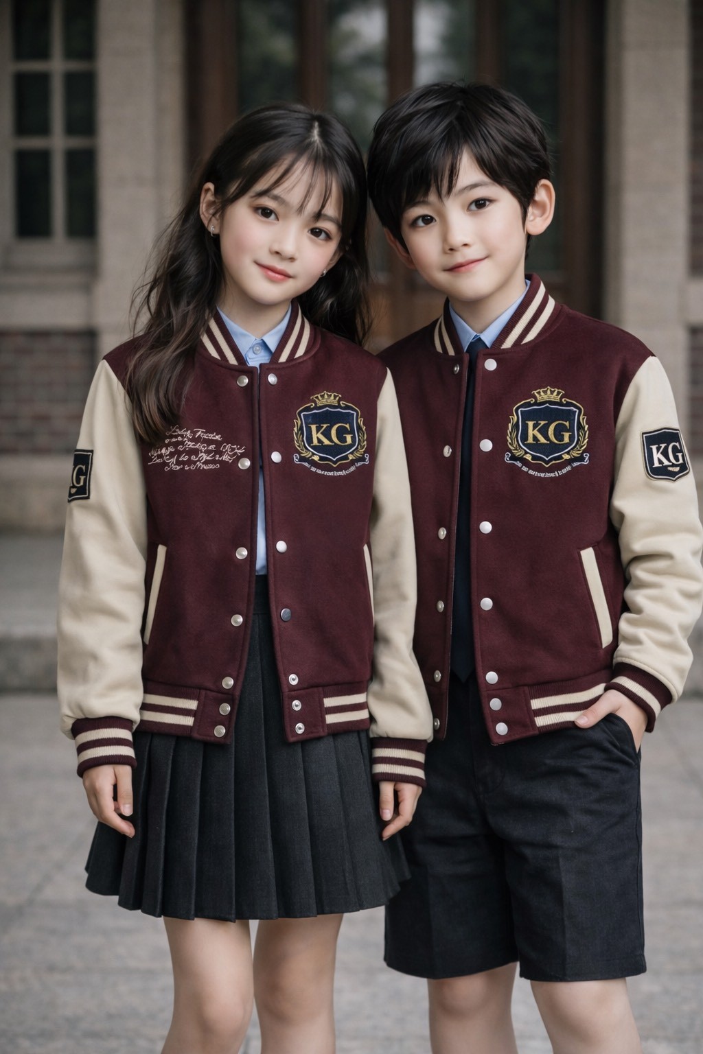 男女ともに、えんじ色のジャケット。スタジャン(コート代わり)。 スカートはタータンチェック柄、グレーなど自由。 男子ズボンはチノパンなど、色は自由。 靴は自由。カバンはデイバッグなど自由。 髪色、髪型は自由。